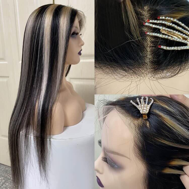 Asteria Har highlight ash grey straight lace front wig, ash grey highlights on black hair straight human hair lace front wig is new hair color trend, black and grey hair mixed highlighted 13x4 lace front wig sell online, ash grey highlights 13x4 frontal wig has ear to ear lace front hairline, 5x5 closure wig is beginner friendly, and it's more affordable, 16 to 24inch black and grey highlights straight hair and body wave wig available. -