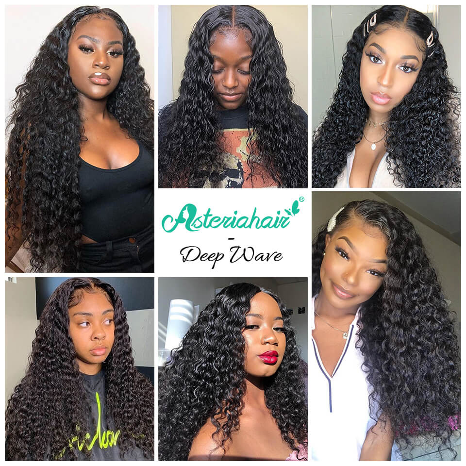 • Asteria Hair deep wave lace front wigs, deep wave hair 4x4 lace closure wigs 180% density medium cap size wig, 4x4 closure wig is a beginner-friendly wig, deep wave 4x4 closure wig has natural hairline, is a glueless wig.